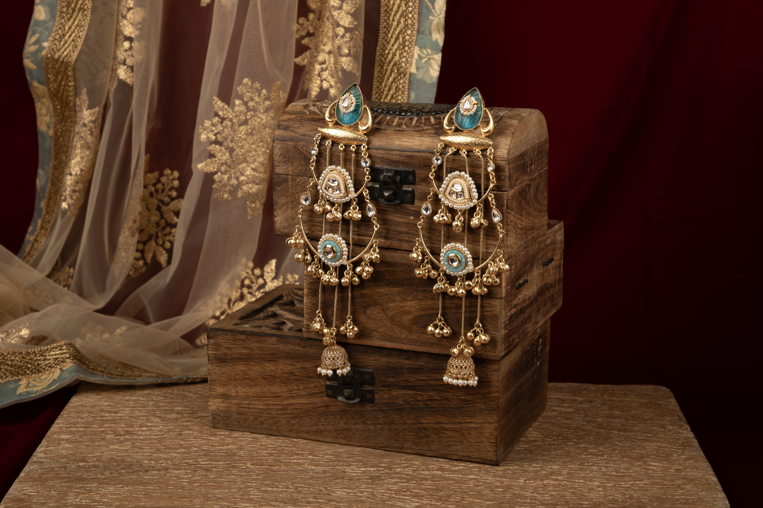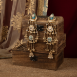 Bring a refreshing elegance to your festive look with these exquisitely handcrafted long earrings, designed to blend delicate colour accents with traditional detailing. The earrings feature a teardrop-shaped stud highlighted with soft aqua-blue enamel and subtle stone accents, creating a calm yet striking visual appeal.