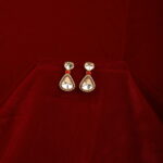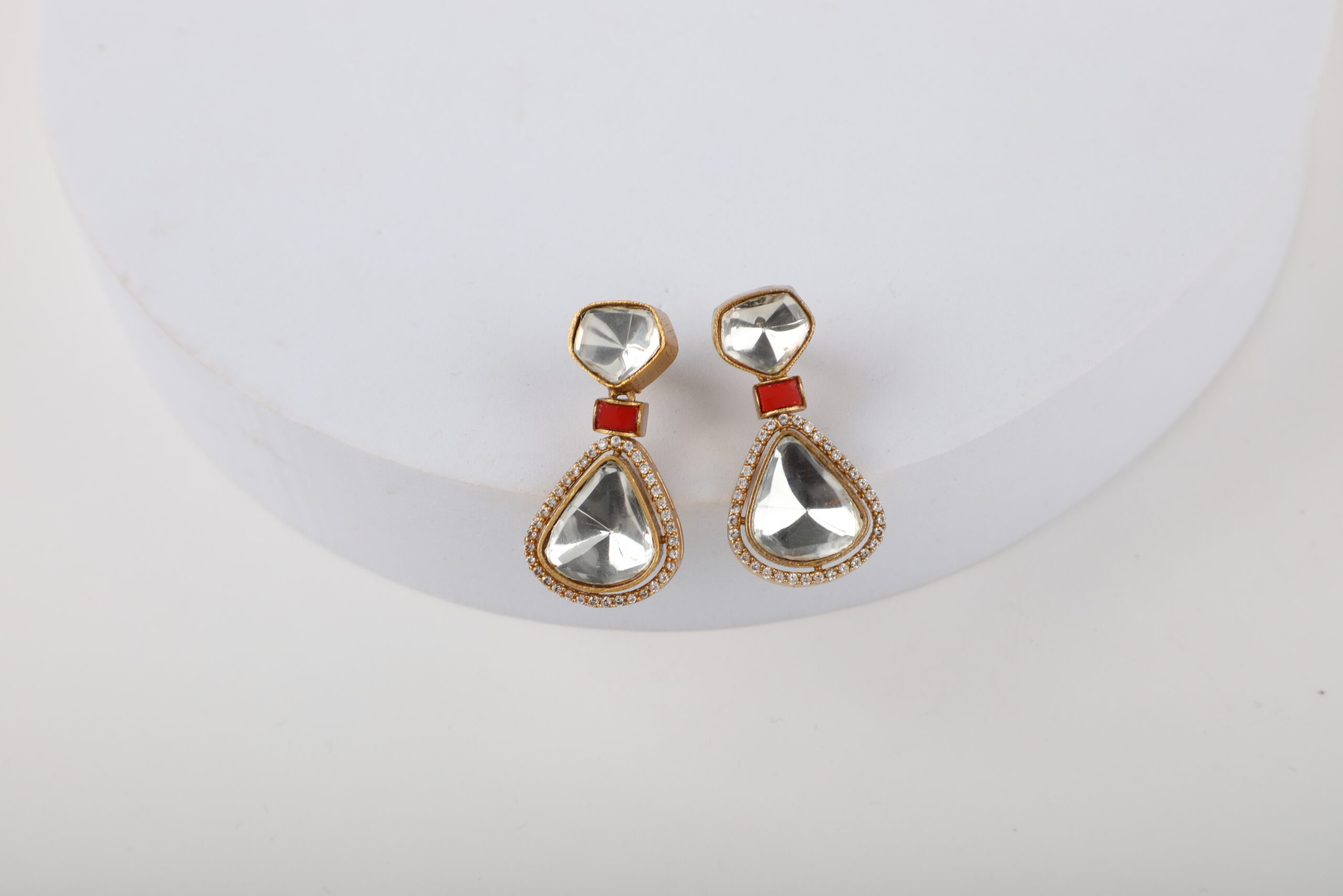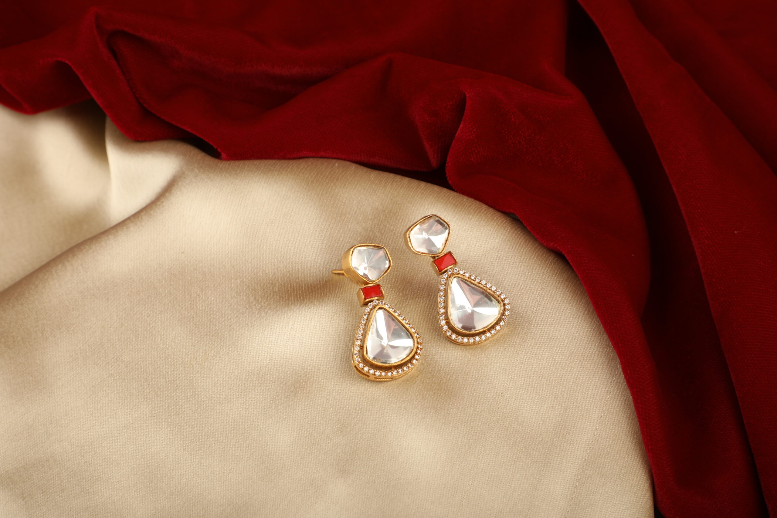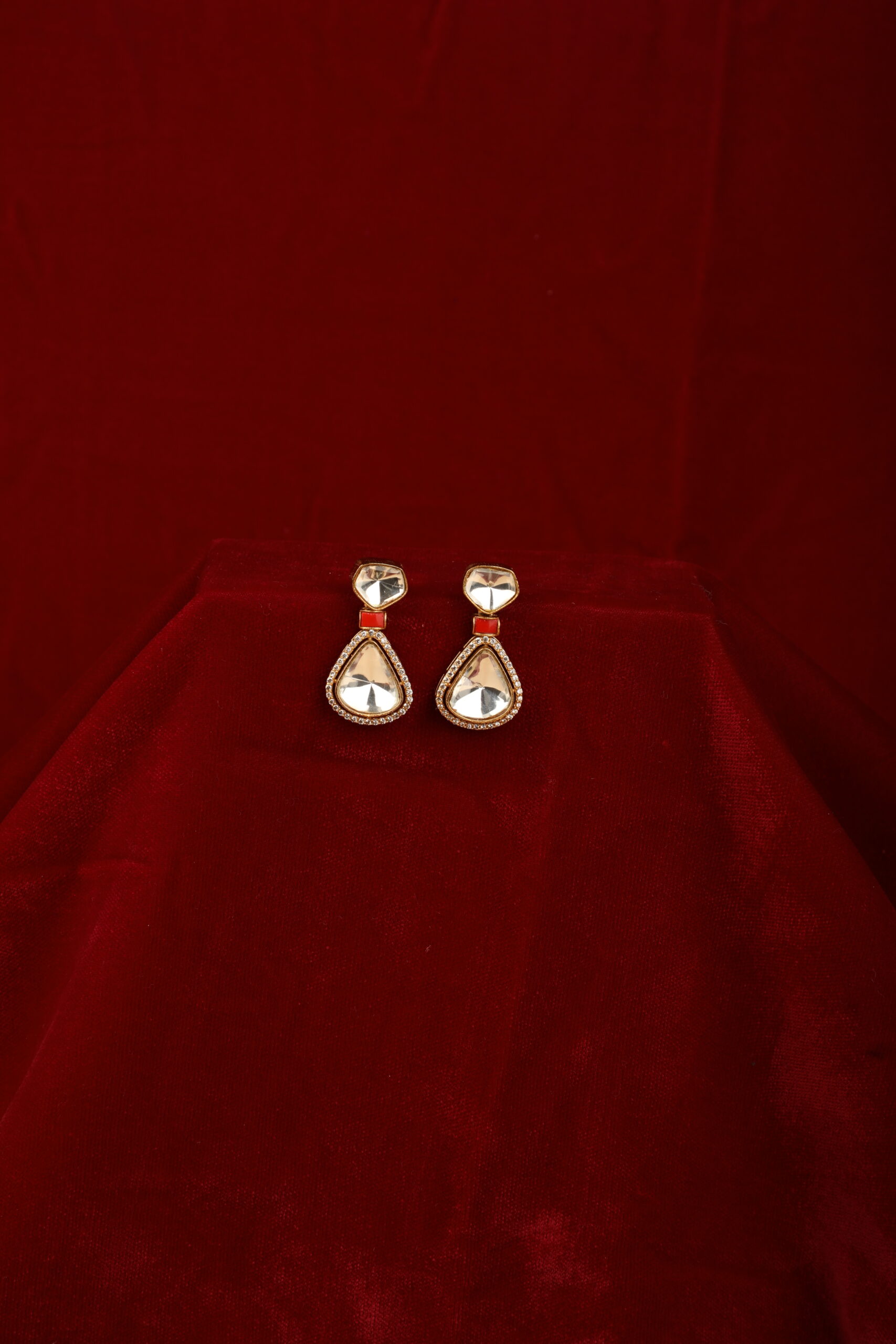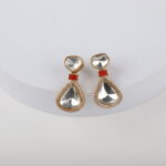 Minimal yet striking, these elegant drop earrings feature mirror-finish kundan stones set in a soft teardrop silhouette, beautifully framed with delicate crystal detailing. A subtle pop of red enamel at the connector adds warmth and contrast, while the gold-tone setting enhances the overall refined appeal. Designed to catch the light effortlessly, these earrings bring understated luxury to any look.