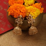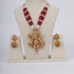 The centerpiece features an intricately sculpted Lord Ganesha pendant in an antique gold finish, symbolising wisdom, prosperity, and new beginnings. Every detail—from the ornate crown to the fluid form—reflects exceptional craftsmanship. The pendant is finished with a subtle dangling bead, adding graceful movement. Complementing the necklace, the matching jhumka earrings echo the temple-inspired design with detailed Ganesha motifs and traditional gold dome drops.