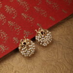 At the center, a striking pendant showcases an intricately sculpted camel motif in a gold-tone finish—symbolising endurance, grace, and cultural heritage. Subtle ruby-toned accents enhance the pendant’s regal appeal, while the surrounding pearl work adds a soft, refined elegance. The matching earrings echo the same design language with pearl clusters and gold detailing, completing the set with perfect harmony.