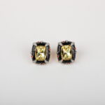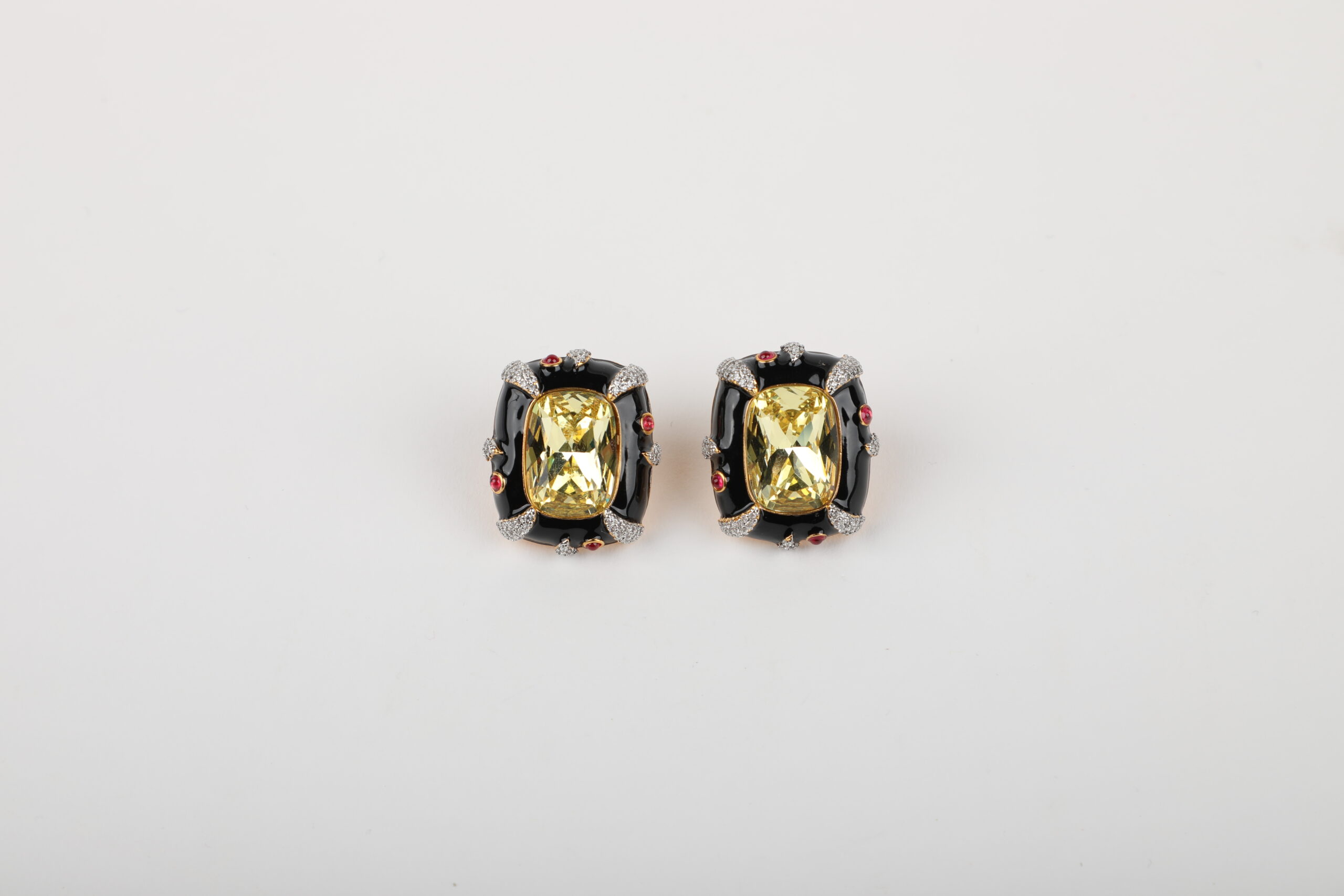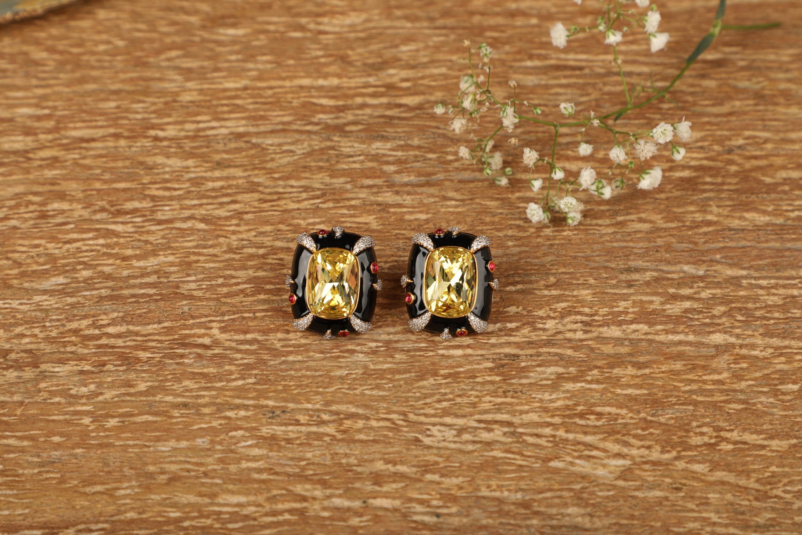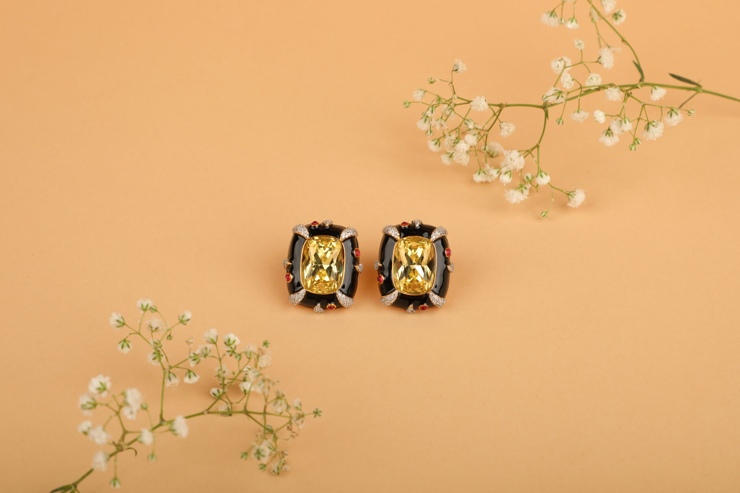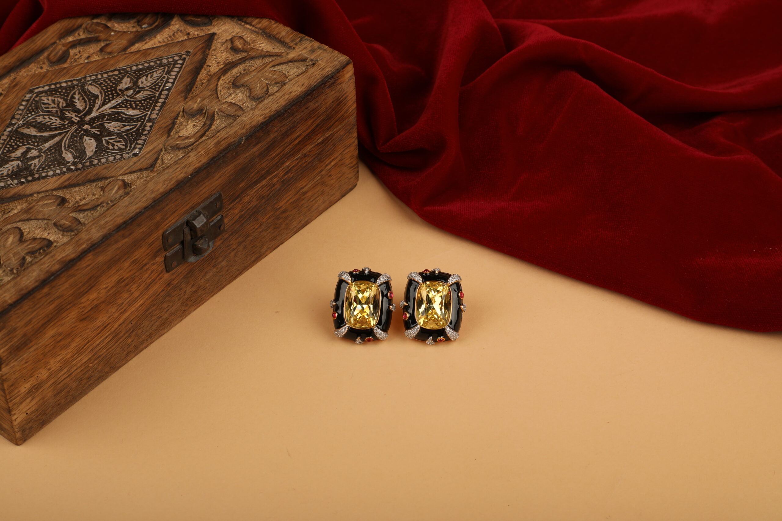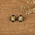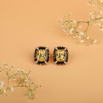 Make a powerful style statement with these luxurious stud earrings designed to command attention. At the heart of each piece lies a radiant champagne-gold rectangular stone, precision-cut to reflect light beautifully. The centre is framed by glossy black enamel contours, accented with subtle ruby-toned highlights and fine crystal detailing that add depth, contrast, and refined sparkle.