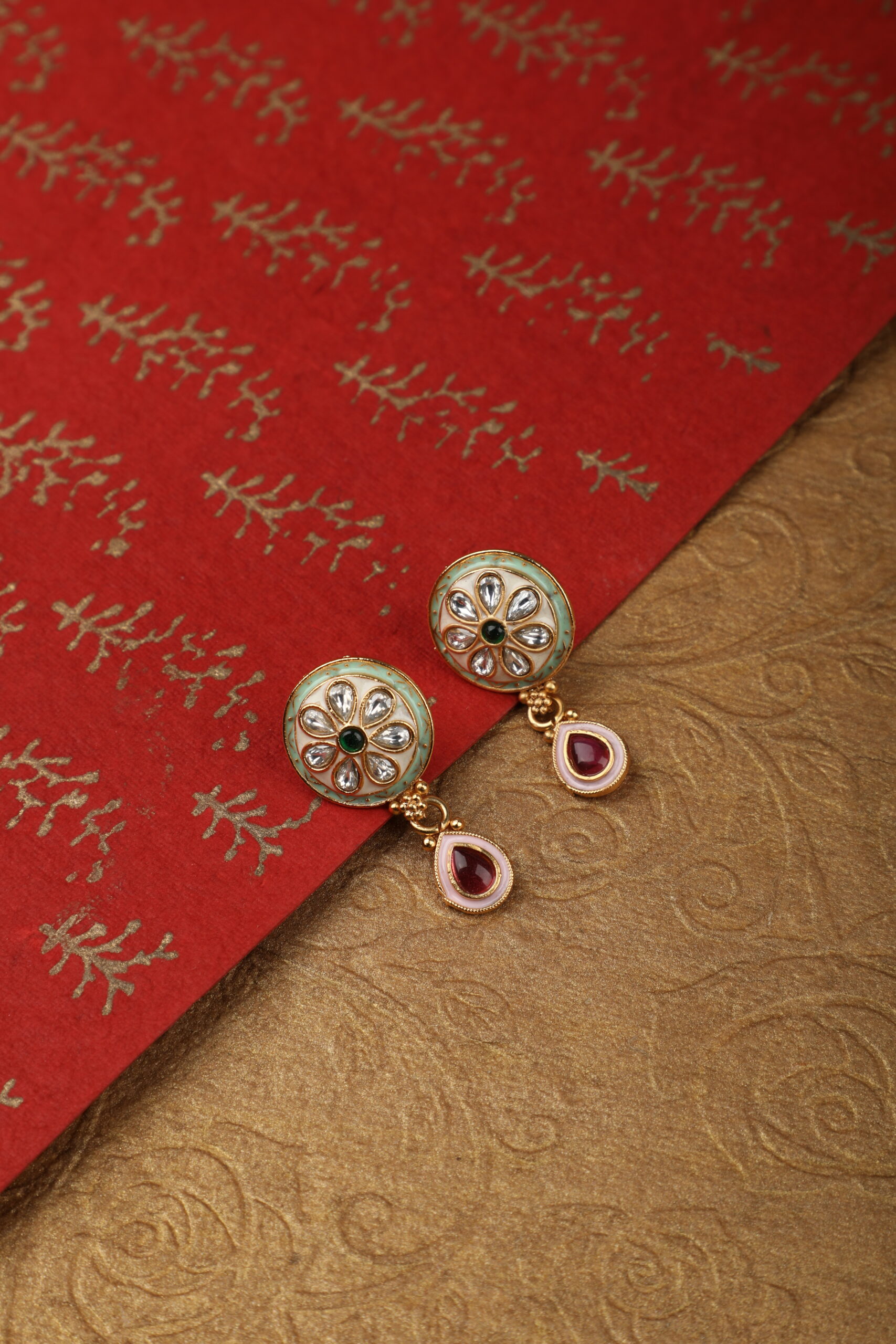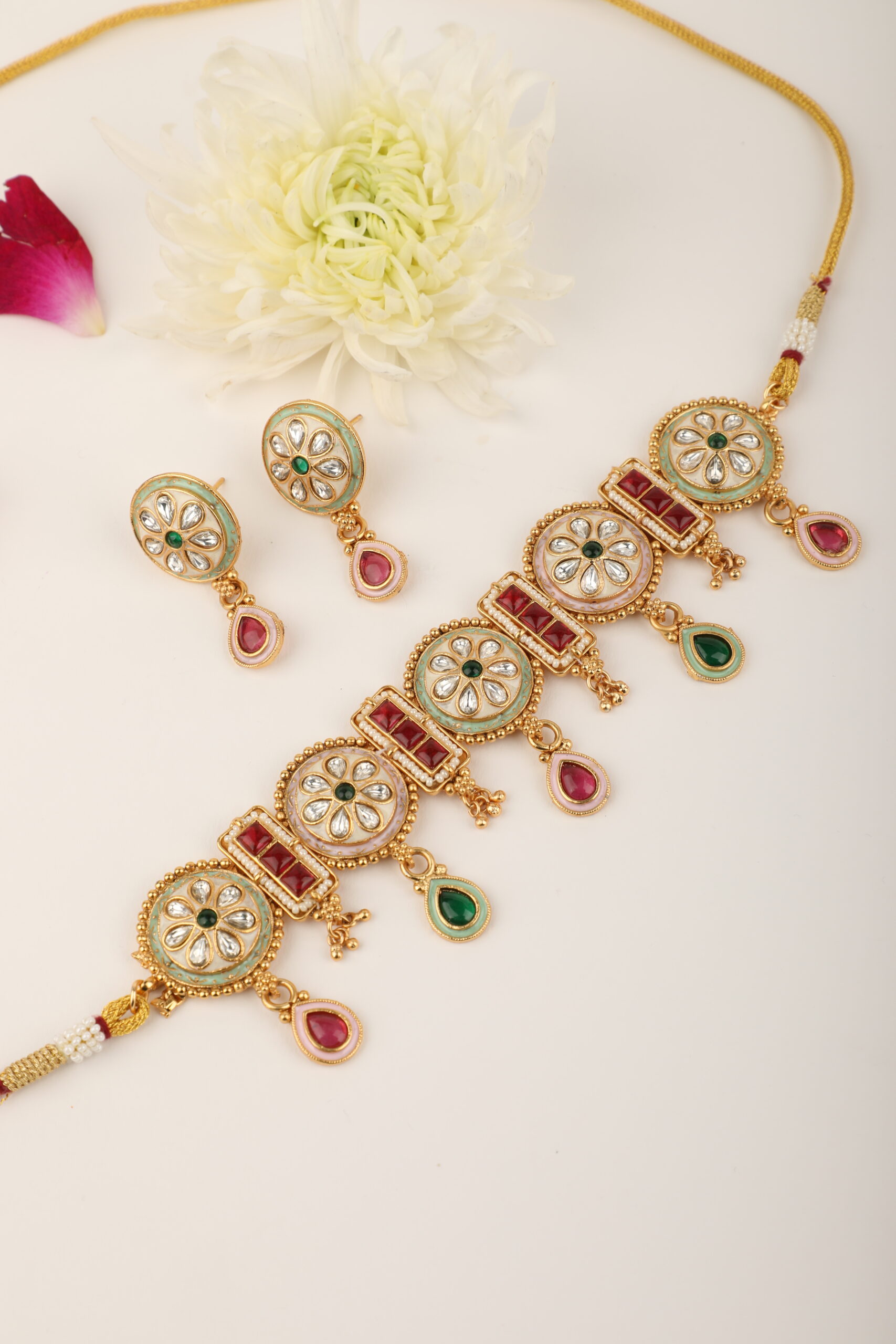 Rich ruby-toned rectangular stones add depth and contrast, while graceful teardrop-shaped danglers in red and green hues lend movement and a vibrant traditional charm to the piece. The matching earrings mirror the floral Kundan motif and are finished with a single dangling stone, creating a balanced and refined ensemble.