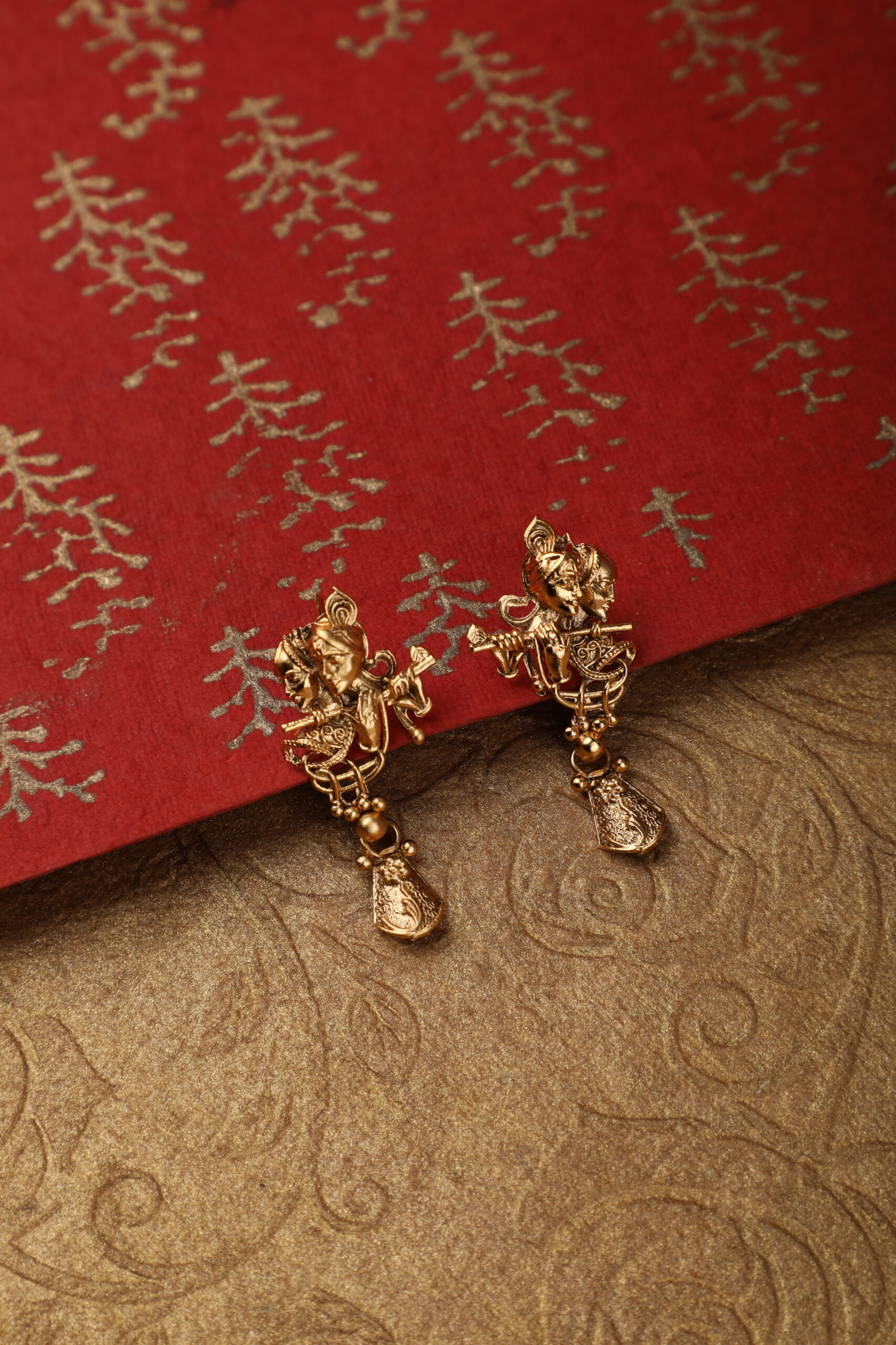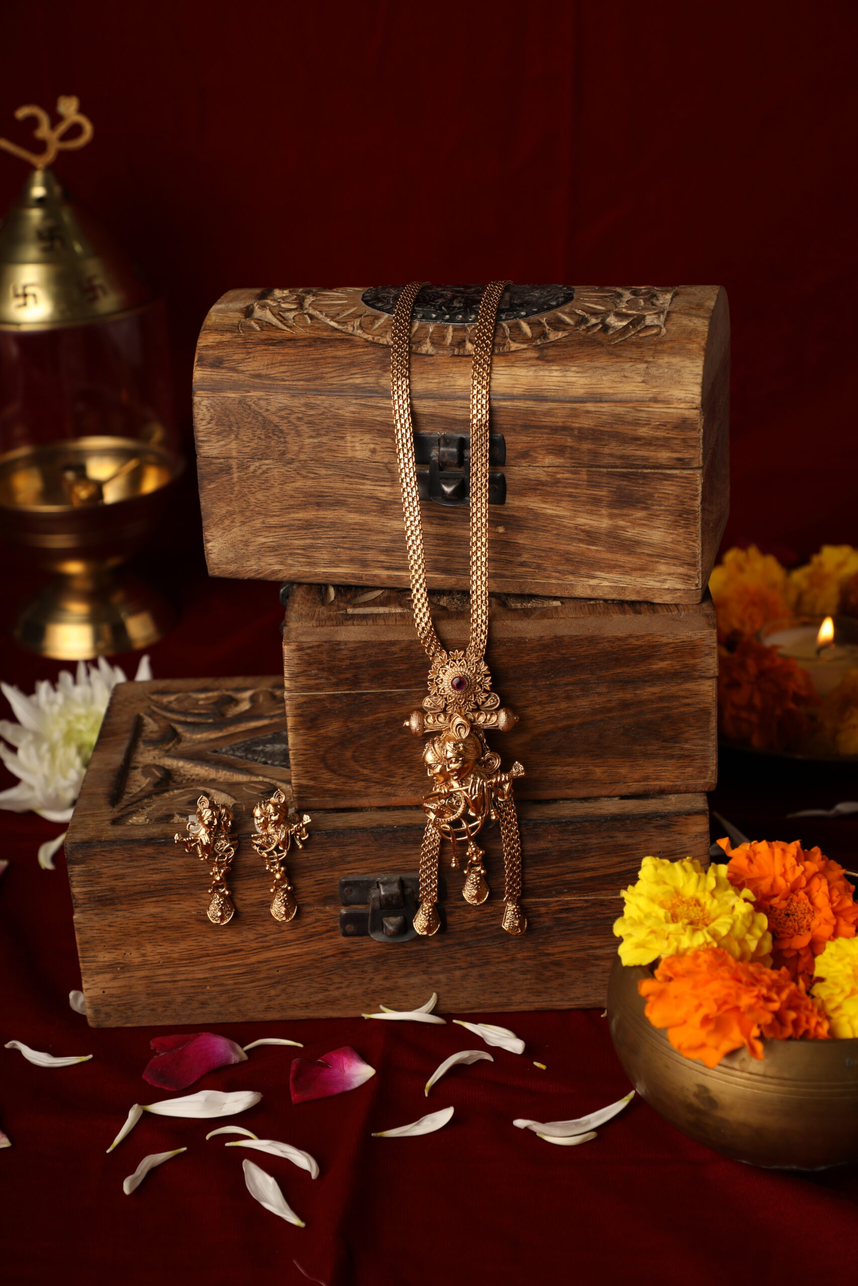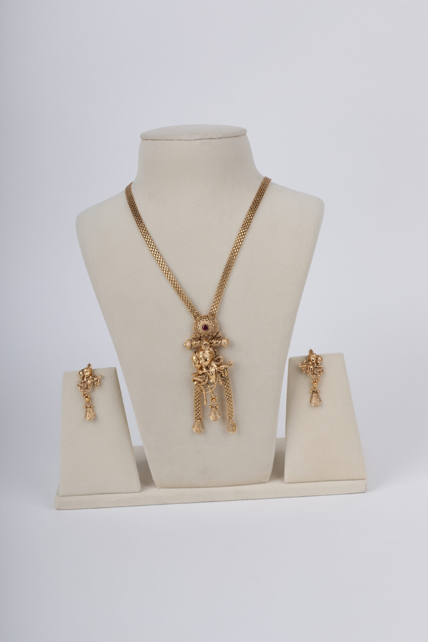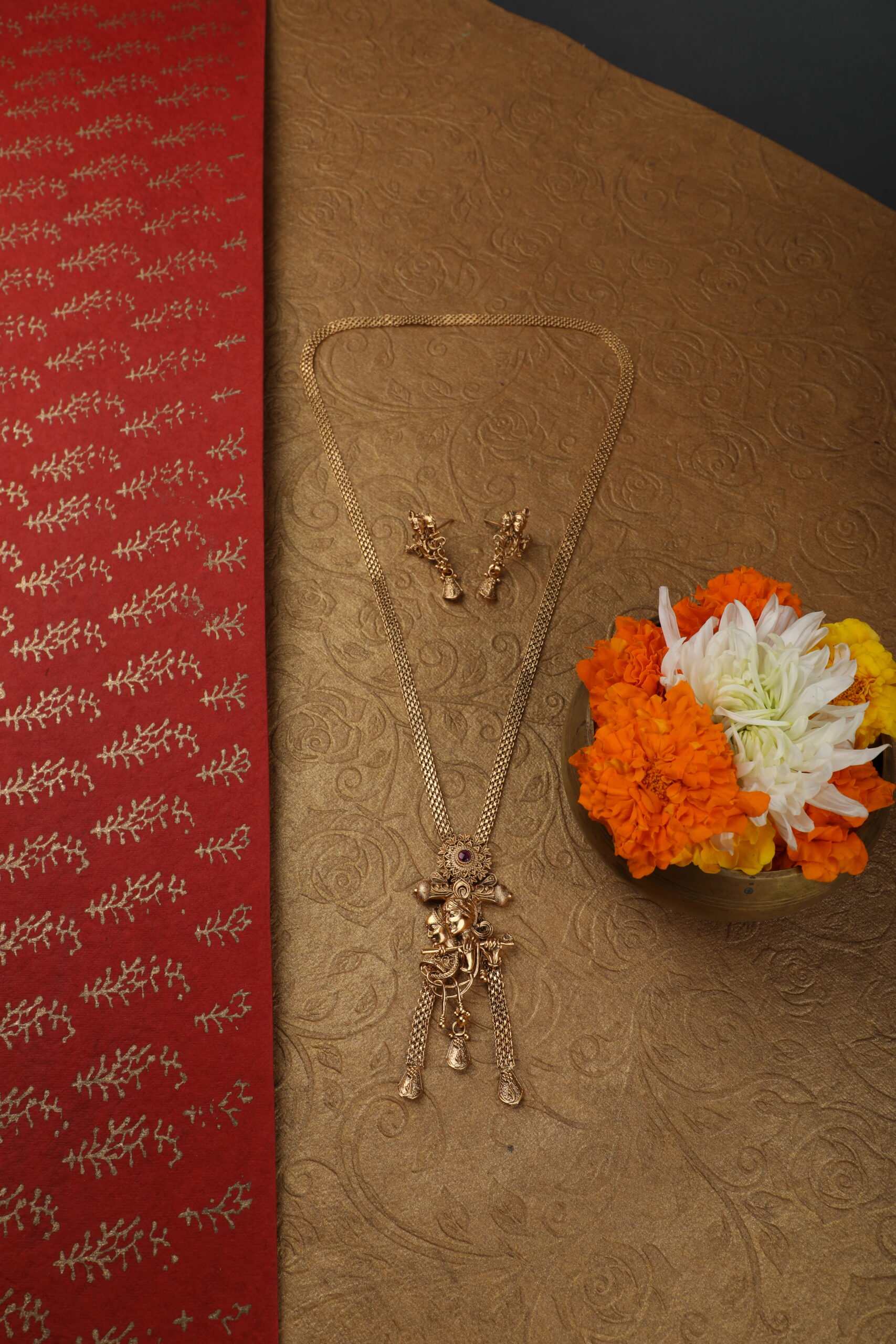 The focal pendant showcases a finely sculpted depiction of Lord Krishna playing his traditional flute with Radha by his side, symbolising divine love, harmony, and devotion. Delicate dangling elements add graceful movement, while subtle ruby-toned accents enhance the antique gold finish, lending the piece a regal and ceremonial charm. The matching earrings echo the same design language in a lighter, elegant form, completing the set with balanced sophistication.