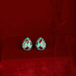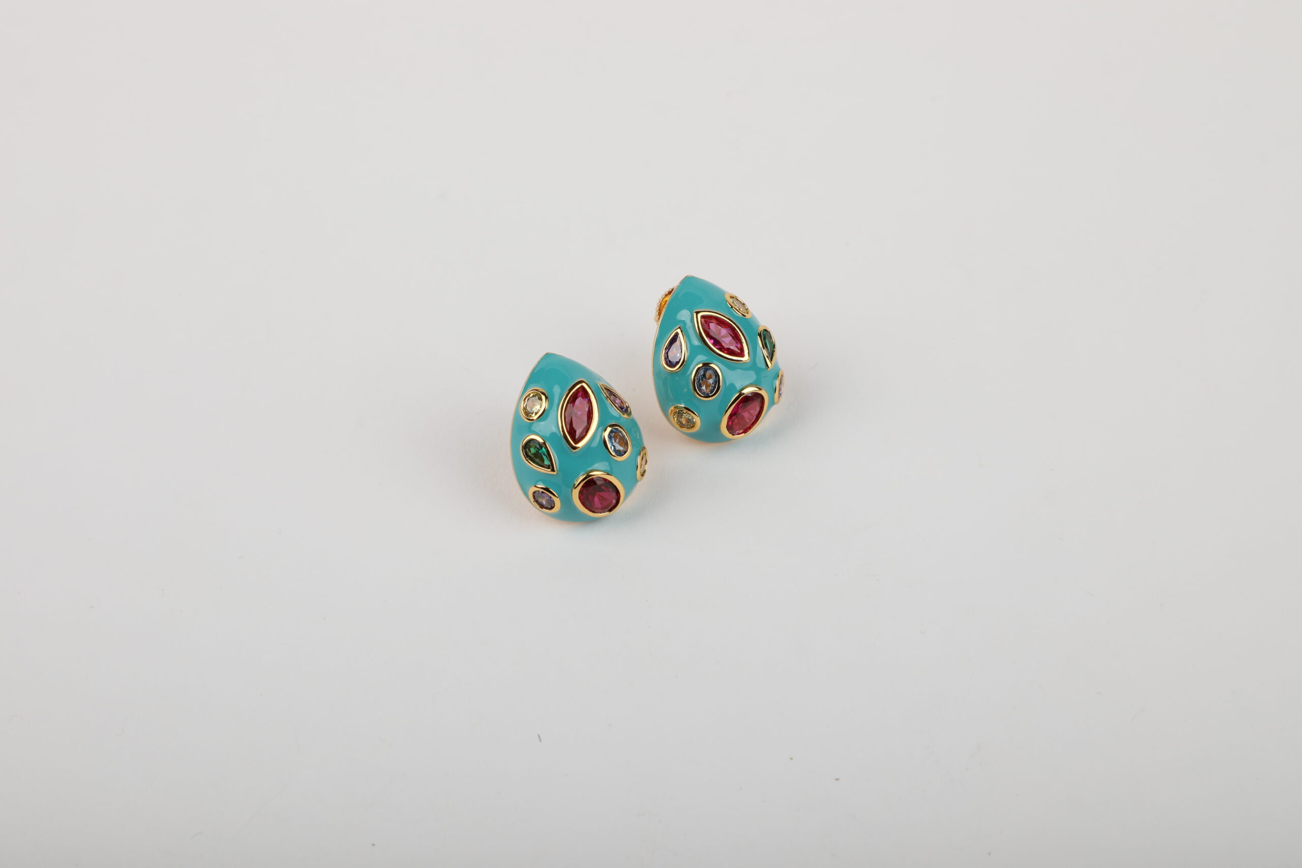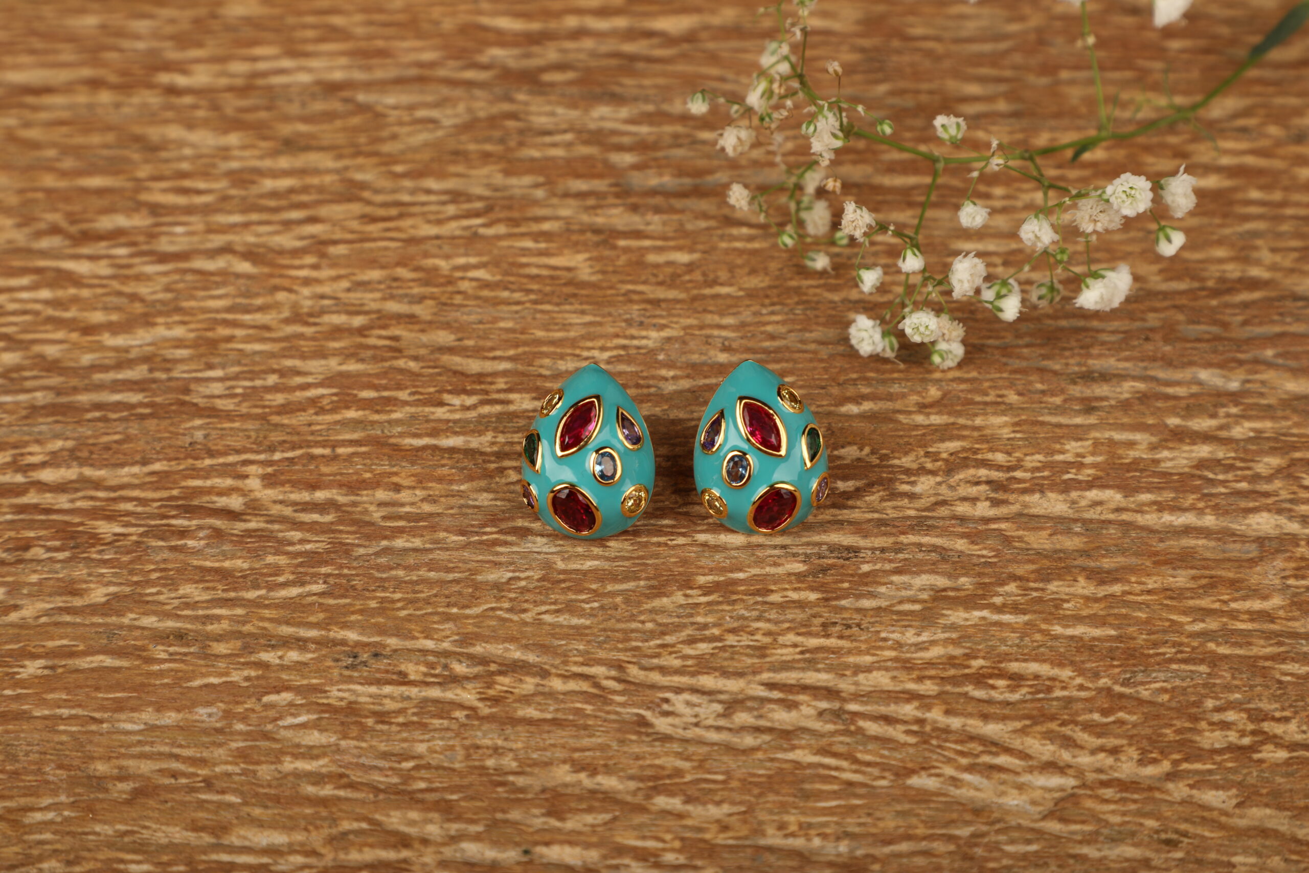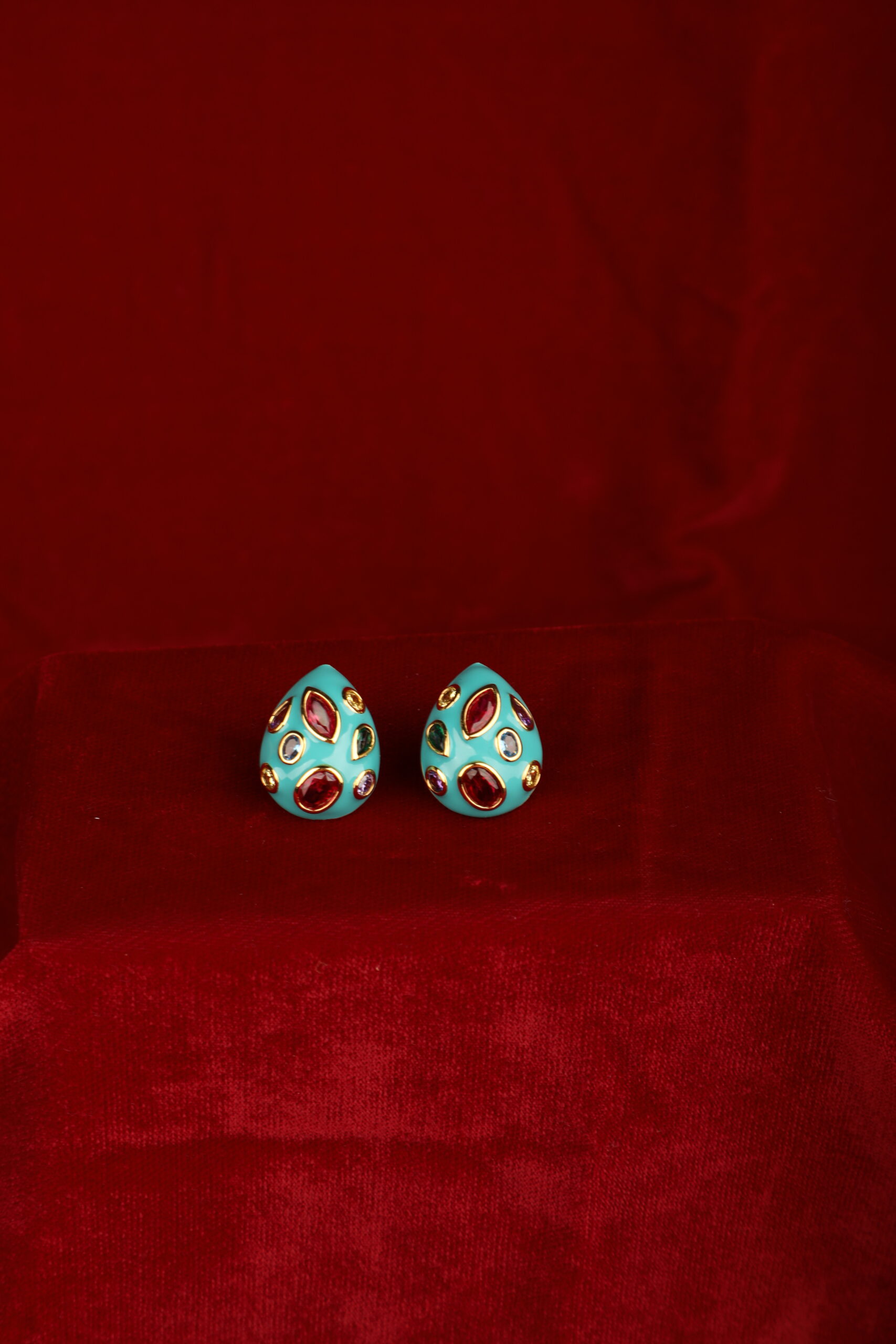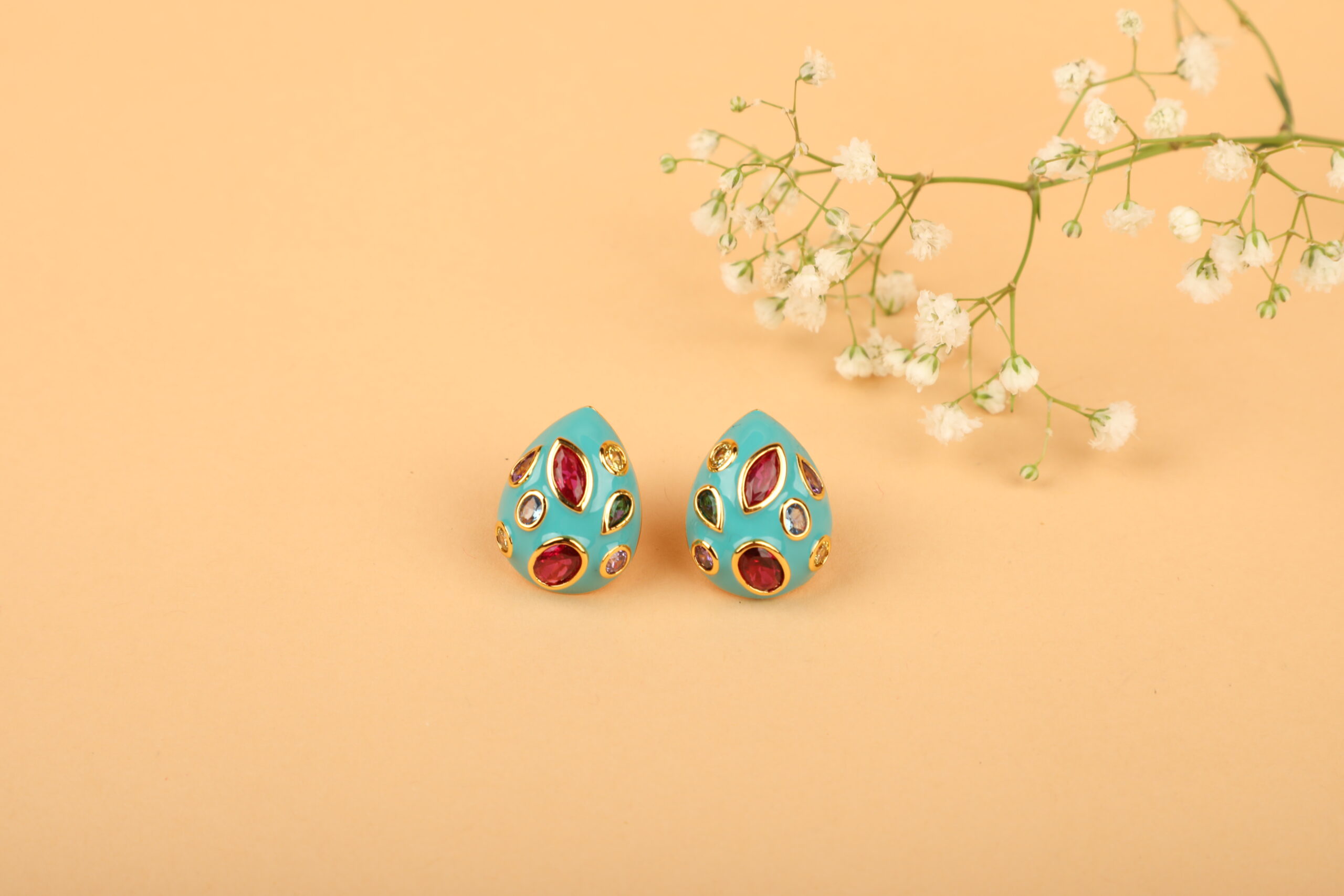 Add a pop of colour and modern elegance to your look with these statement stud earrings. Designed in a soft turquoise enamel base, the earrings are accented with multi-shaped crystal embellishments in rich ruby, emerald, and champagne tones. The teardrop silhouette creates a bold yet refined profile, while the gold-tone detailing adds a luxurious finish.