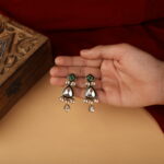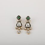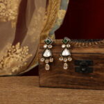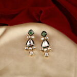An expression of intricate artistry, this design features layered golden detailing accented with deep green stone elements that add richness and contrast. Fine moti-style drops soften the structured form, creating a graceful balance between strength and fluidity. Designed to feel festive, expressive, and rooted in tradition.
