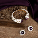 The open ends are crowned with deep amethyst-hued stones, lending a rich contrast and a touch of regal sophistication. A polished gold interior enhances comfort while ensuring a luxurious finish from every angle. Sculptural yet refined, this bracelet is perfect for elevating both ethnic and contemporary looks.
