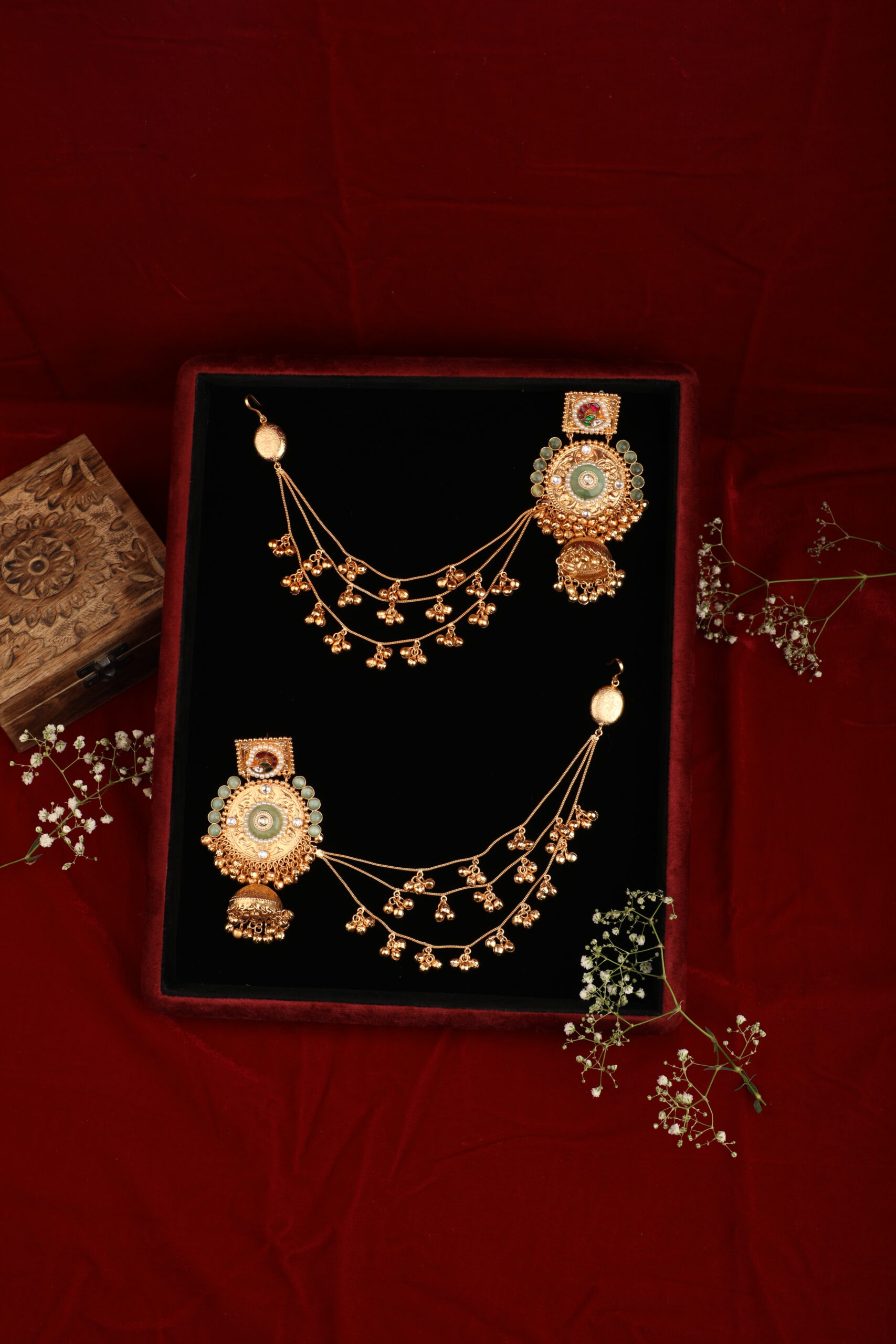 Flowing chain tassels adorned with clusters of polished gold beads cascade beautifully below, creating a rhythmic sway that adds elegance with every movement. The balanced design brings together symmetry, texture, and traditional craftsmanship, making these earrings visually striking yet refined.