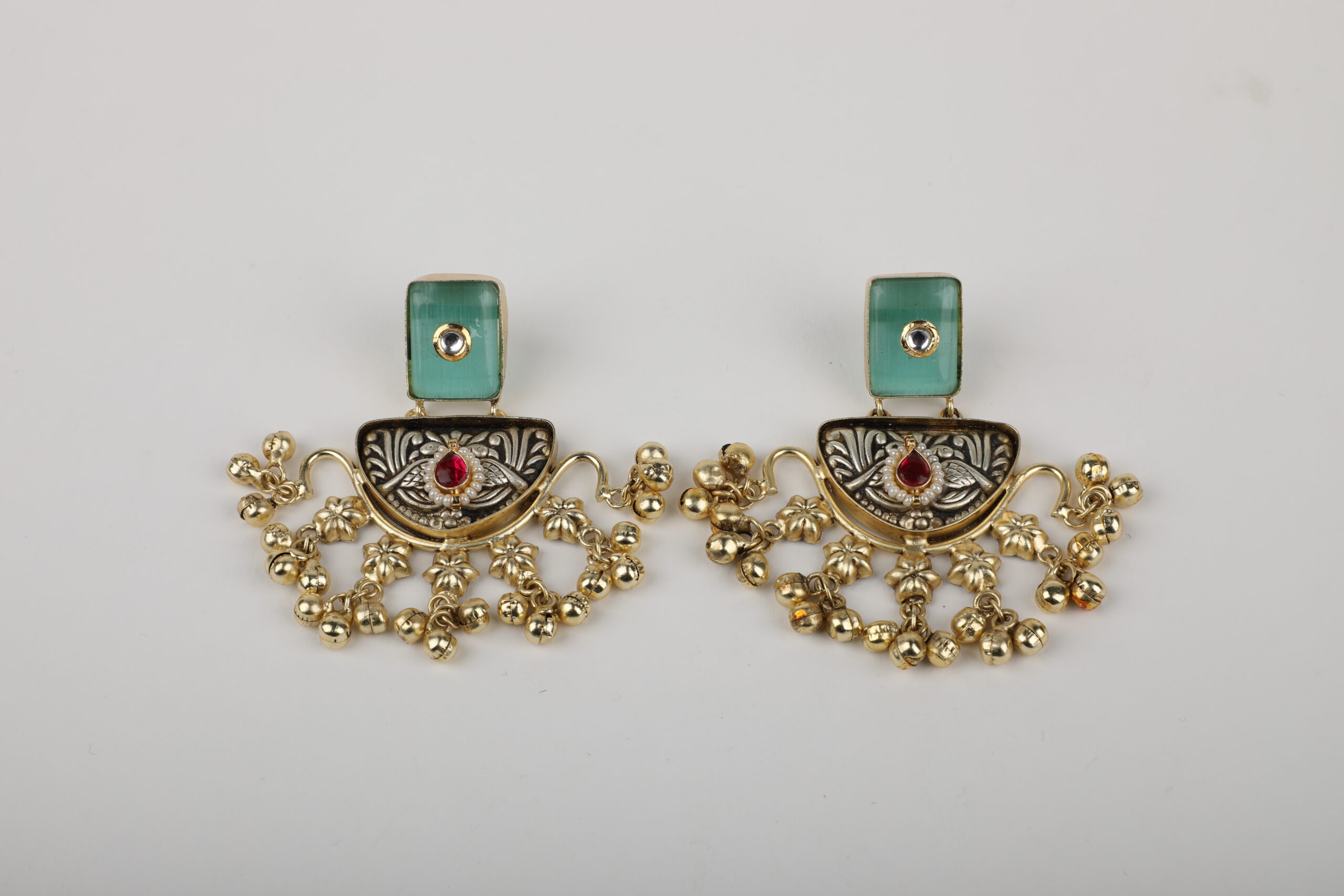Make a striking style statement with these handcrafted statement earrings that blend contemporary geometry with traditional detailing. The design features a sleek rectangular green stone stud, accented with a subtle crystal highlight, leading into an intricately carved semi-circular motif inspired by classic Indian patterns. A rich ruby-toned stone at the centre adds depth and contrast to the antique-finish metalwork.