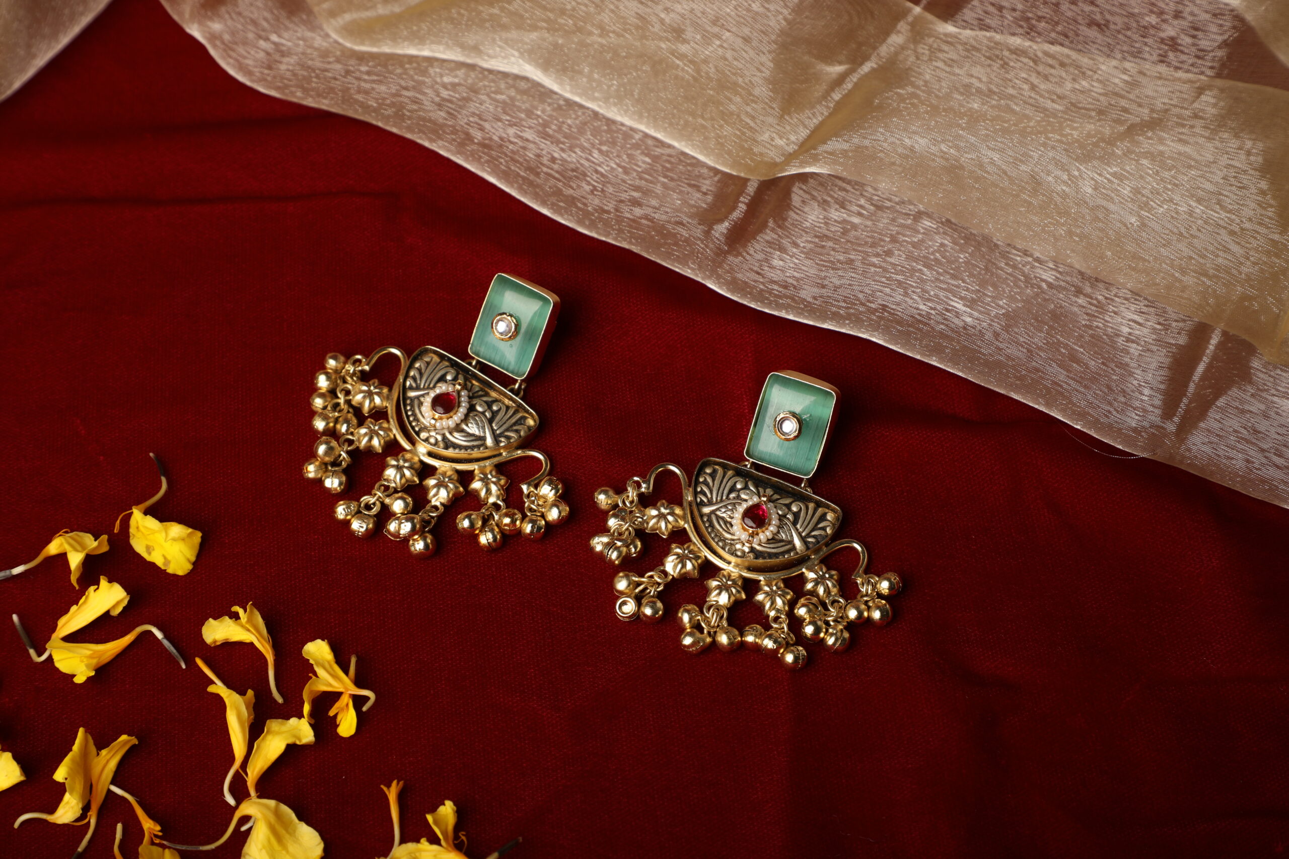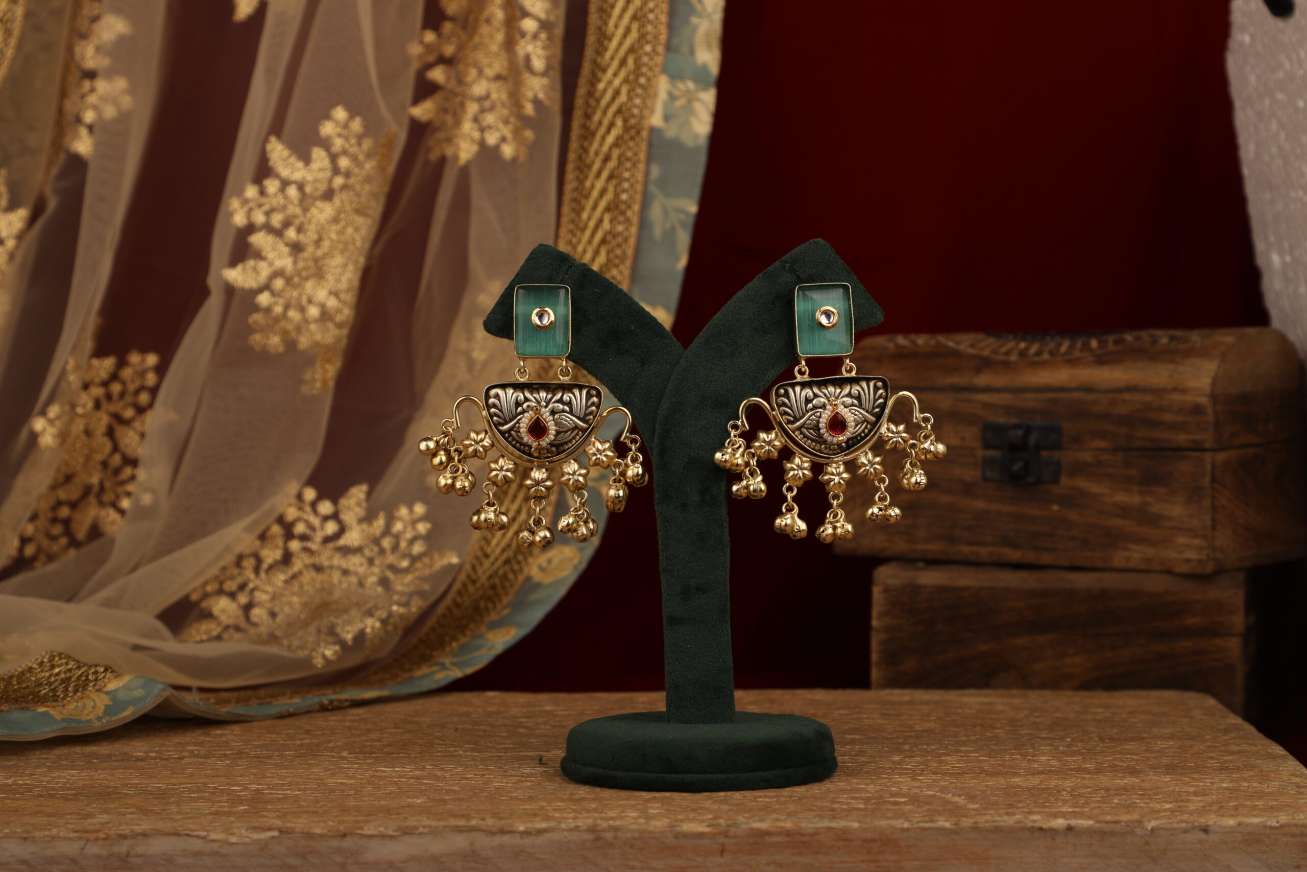 The lower edge is adorned with clusters of delicate gold-toned ghungroo drops, creating graceful movement and a soft rhythmic charm with every step. Balanced yet bold, these earrings are designed to stand out while retaining an elegant, artisanal appeal.