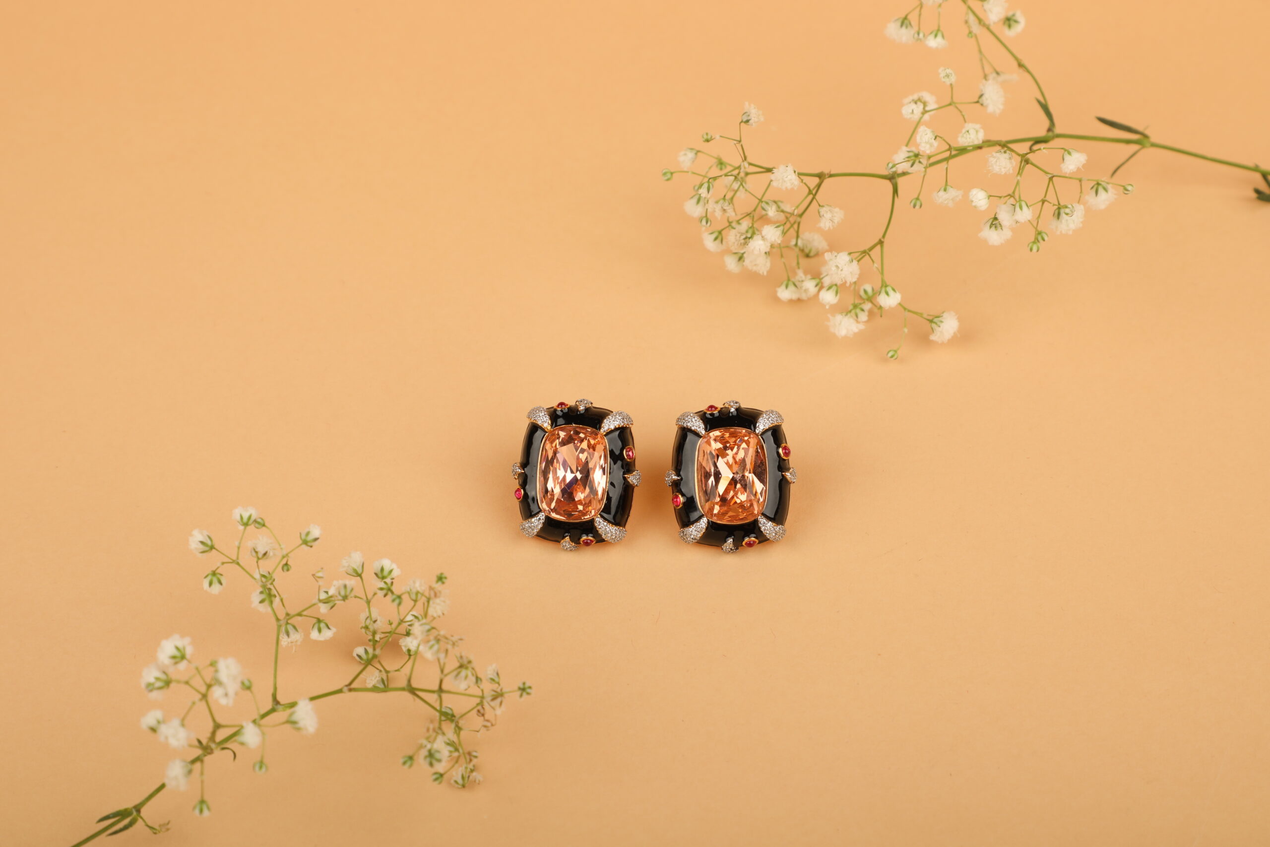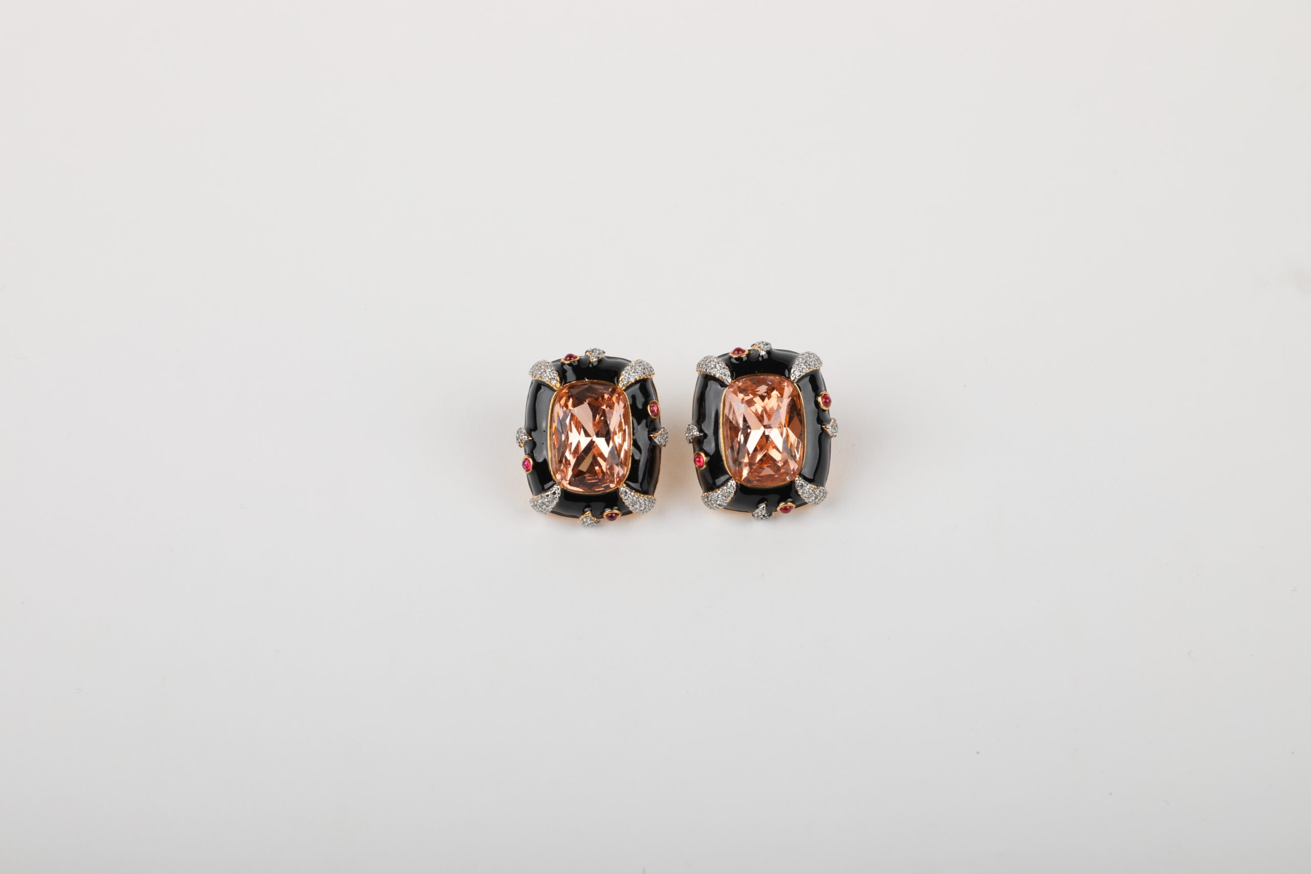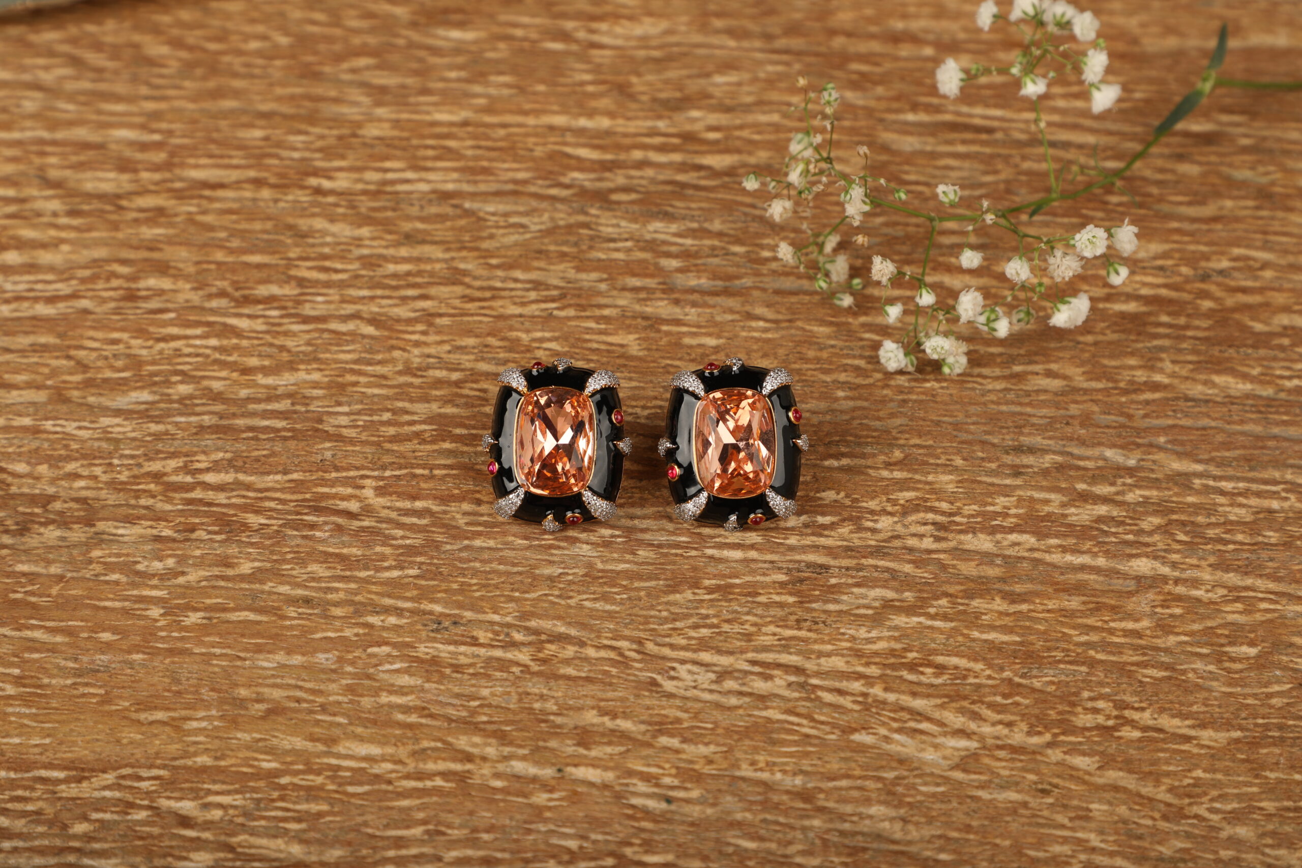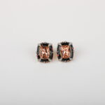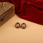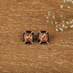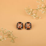 Elevate your style with these bold, statement stud earrings crafted to exude modern luxury. Featuring a striking champagne-hued rectangular stone at the centre, the design is framed with sleek black enamel accents that create a dramatic contrast. Delicate crystal detailing and subtle ruby-toned highlights add depth, sparkle, and a refined finish to the overall look.