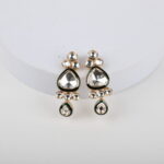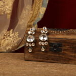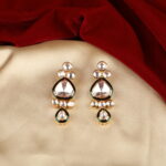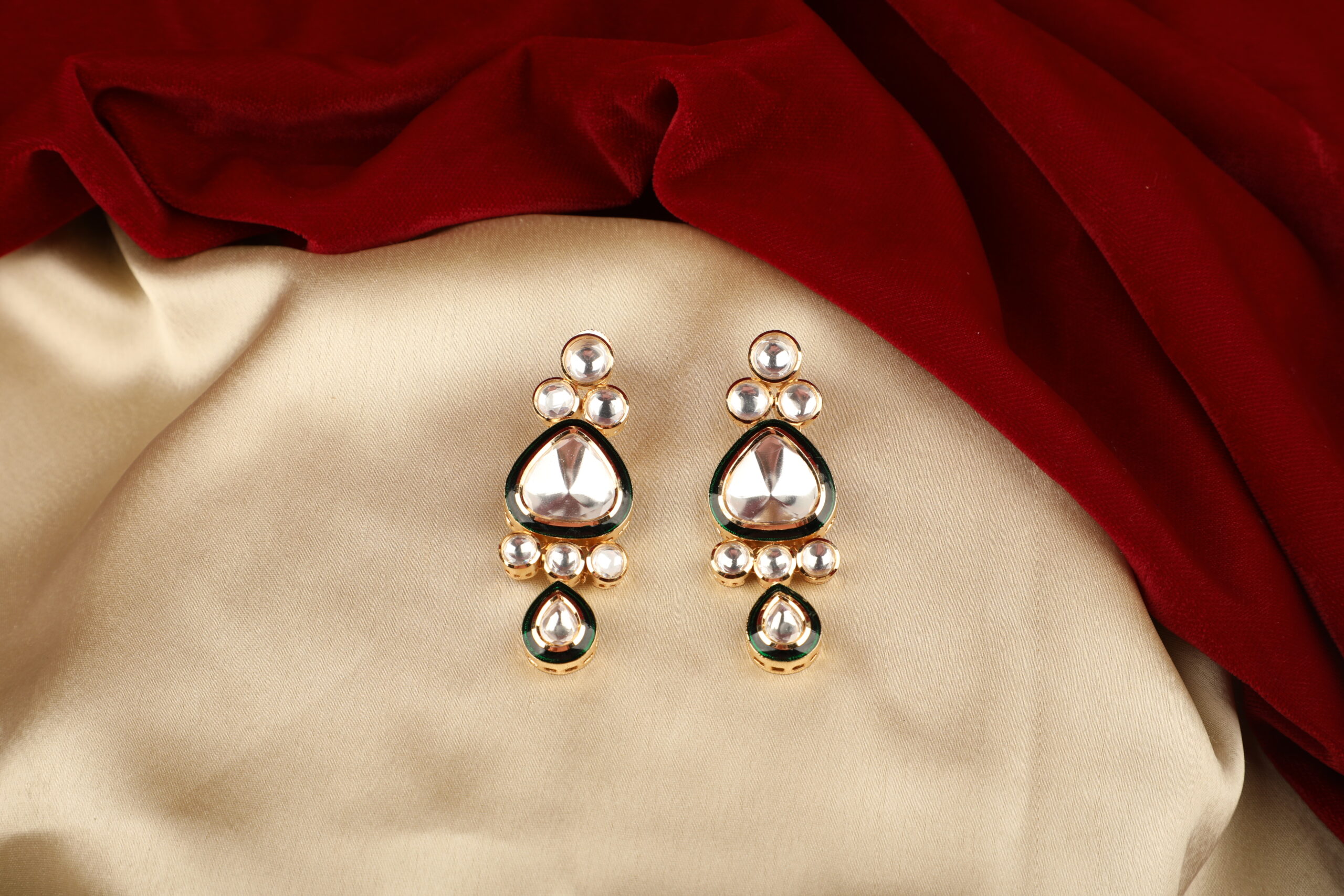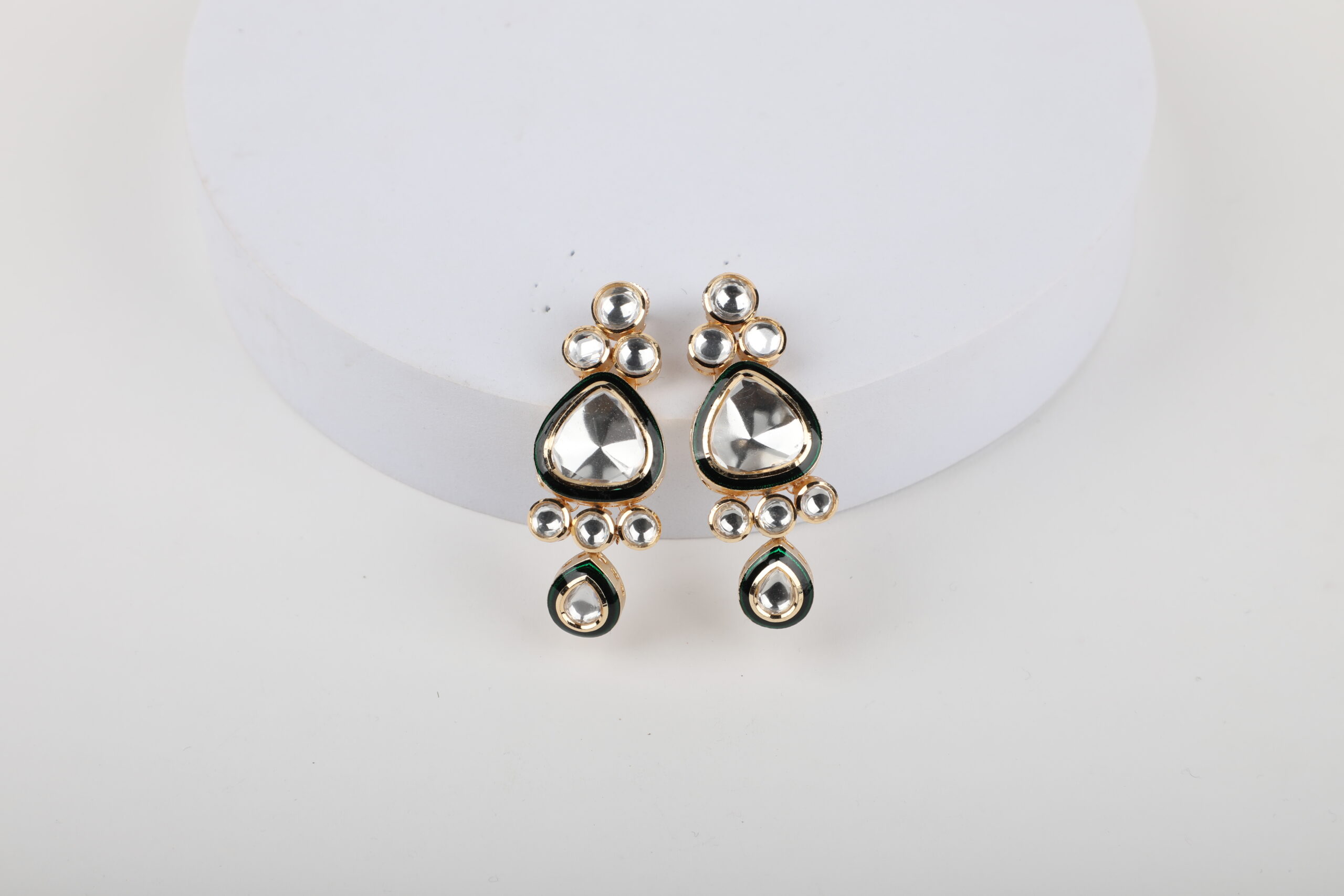 Elevate your ethnic elegance with these classic Kundan drop earrings, designed to reflect timeless Indian craftsmanship. Featuring polished mirror-cut Kundan stones set in a rich gold-tone frame, the design is accentuated with subtle green enamel detailing that adds depth and contrast. The layered arrangement and gentle drop silhouette create a graceful movement that catches the light beautifully.